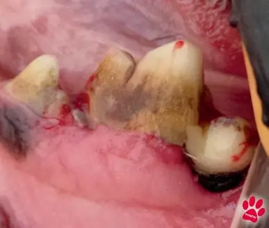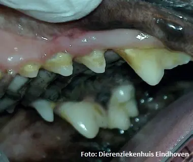 Hvis det er brunt belegg på tennene til hunden eller katten din og det er dårlig sirkulasjon i tannkjøttet (se bilde), anbefaler vi deg å kontakte veterinæren din. Dyret ditt har da tannstein. Tannstein dannes når plakk forkalker. Uansett hvor det er plakk, kan det dannes tannstein. Tannstein kan ikke lenger børstes bort og må fjernes i narkose hos veterinær. Tannrengjøring kan være veldig dyrt.
